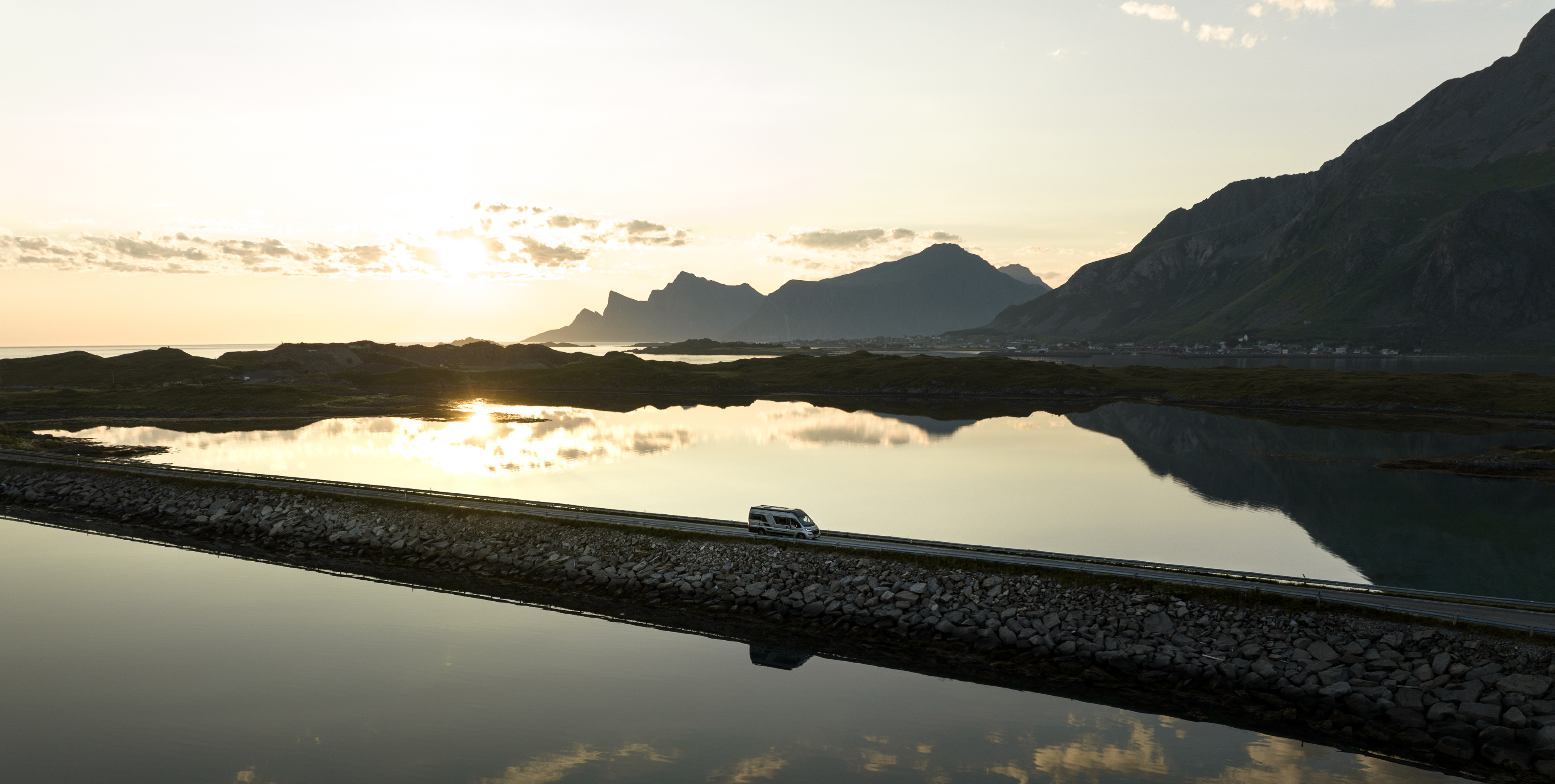 Toen we de Lofoten bereikten, werden we verwelkomd door een ongekend paradijs. Reusachtige torenhoge bergen ontmoetten kristalhelder turkoois water. Toen de nacht aanbrak, bedekte de middernachtzon alles met een gouden sluier. Ze omarmde ons met haar zachte, slepende licht en we wisten intuïtief dat dit het avontuur van ons leven zou worden. Het constante zonlicht liet ons midden in de nacht de bergen in wandelen en we hadden het gevoel dat we nooit wilden gaan slapen. Maar toen we thuiskwamen en in ons comfortabele bed gingen liggen, konden we onze ogen niet lang openhouden.