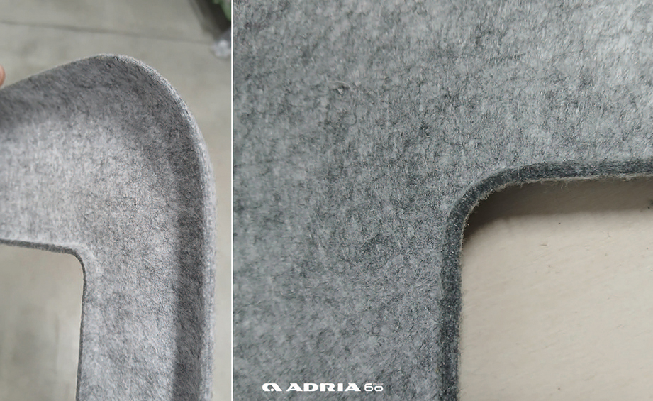 1b) Symalite™ ter vervanging van multiplex - met polyesterConstructie technisch gebeurt hetzelfde als bij toepassing 1a, echter wordt het Symalite™ niet voorzien van een laag folie maar van een dunne laag polyesterweefsel (PES). Dit voelt een beetje aan als vilt en geeft meteen een “warm” gevoel. Deze toepassing is terug te zien in Altea en Aviva Lite.
