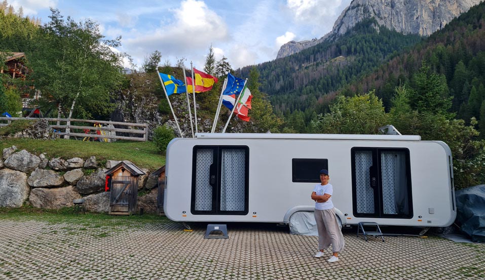 Winters in de Dolomieten en zomers op Sardinië. Het is een vol leven, een wirwar van activiteiten en momenten van ontspanning, met de Astella als verplaatsbaar basiskamp. Beiden genieten van alpine skiën en langlaufen, fietsen, paddleboarden, bridge spelen, vreemde talen leren, lezen en het ervaren van rustige momenten in de natuur, vanuit het comfort van hun speciale thuis op wielen.